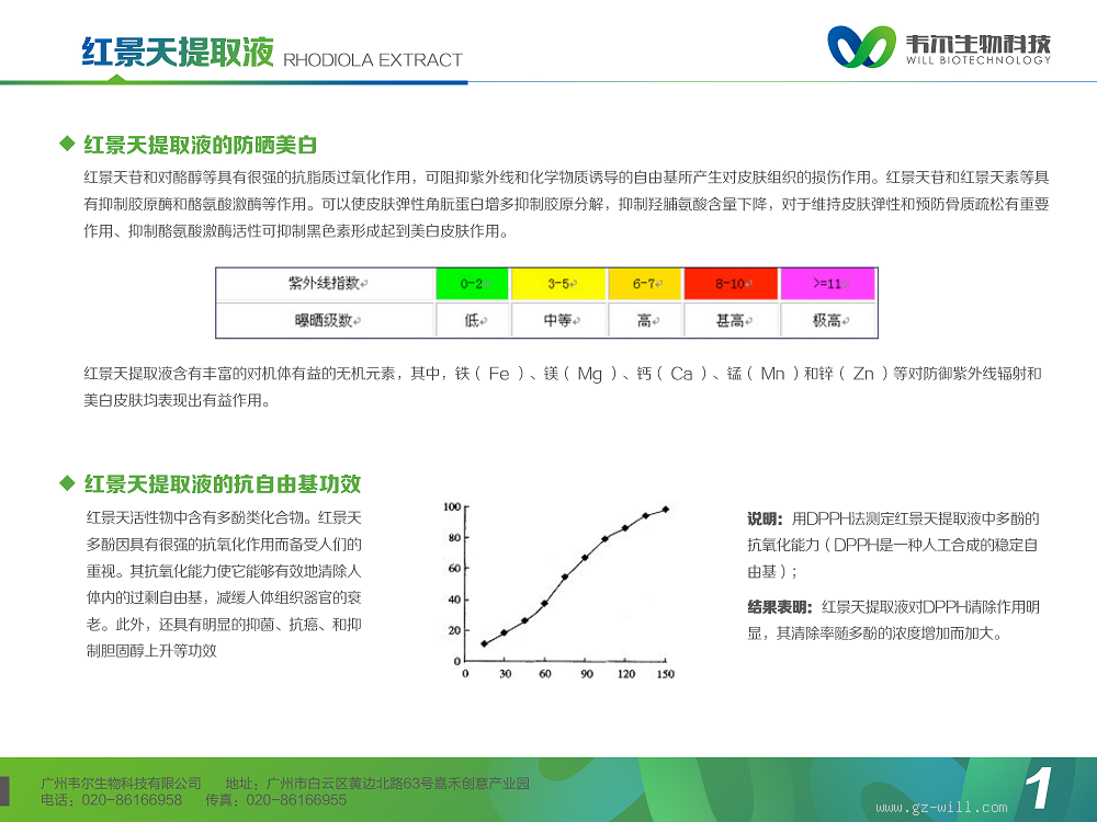 Rhodiola红景天提取液 具有美白、防护、抗皱、滋养肌肤等多种功效,适合任何肤质适用,可用于防晒产品、抗氧化产品、补水产品、男士护理产品等,使皮肤更加健康美白。